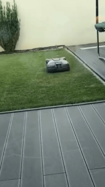 なんと、視線の先にあったのは、お庭で忙しそうに動き回る芝刈り機でした!