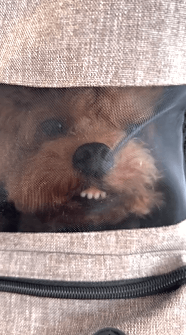 今回ご紹介するのは、リュックの中から外を覗き込むトイプードルのちくわちゃん。