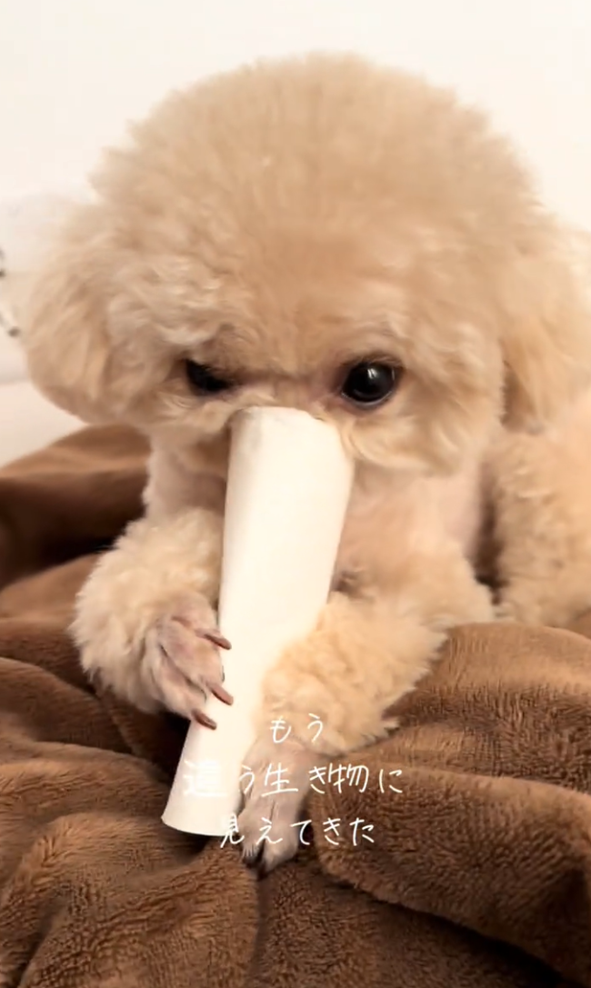 ペーパーの芯(お気に入り)を取られたくないトイプードルが取った行動に「予想の斜め上行った」「違う生き物だ」の声【動画】