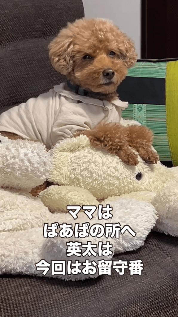 大好きなママさんのお出かけに、悲しげな表情を浮かべるトイプードルの英太くん。