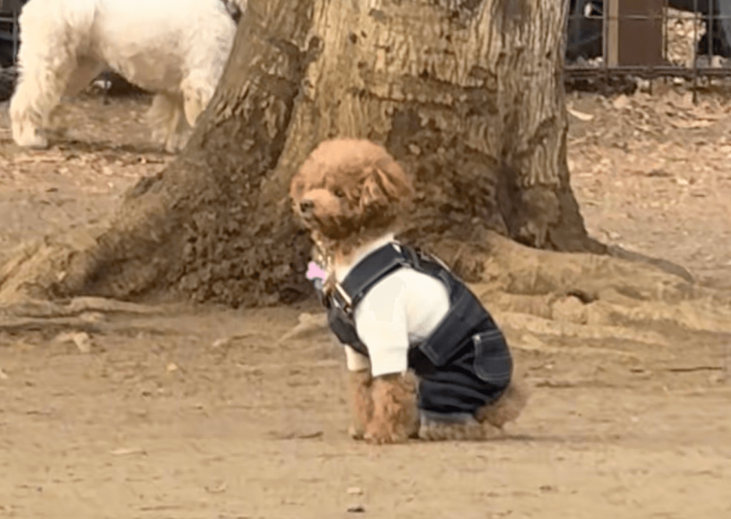 ドッグランで元気に遊ぶワンちゃんたちの中に、どこか不安そうな表情のトイプードル・らなちゃんの姿が。