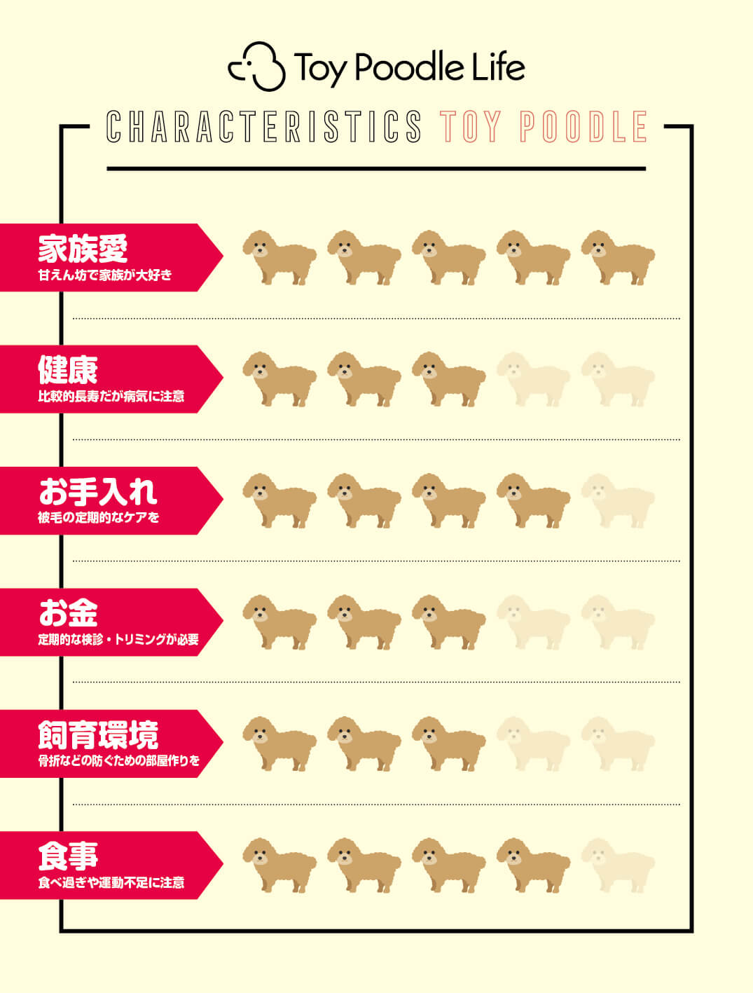 トイプードルの性格や身体の特徴、健康面、飼いやすさ、カットの種類、歴史など、トイプードルにまつわる情報をまとめました。
